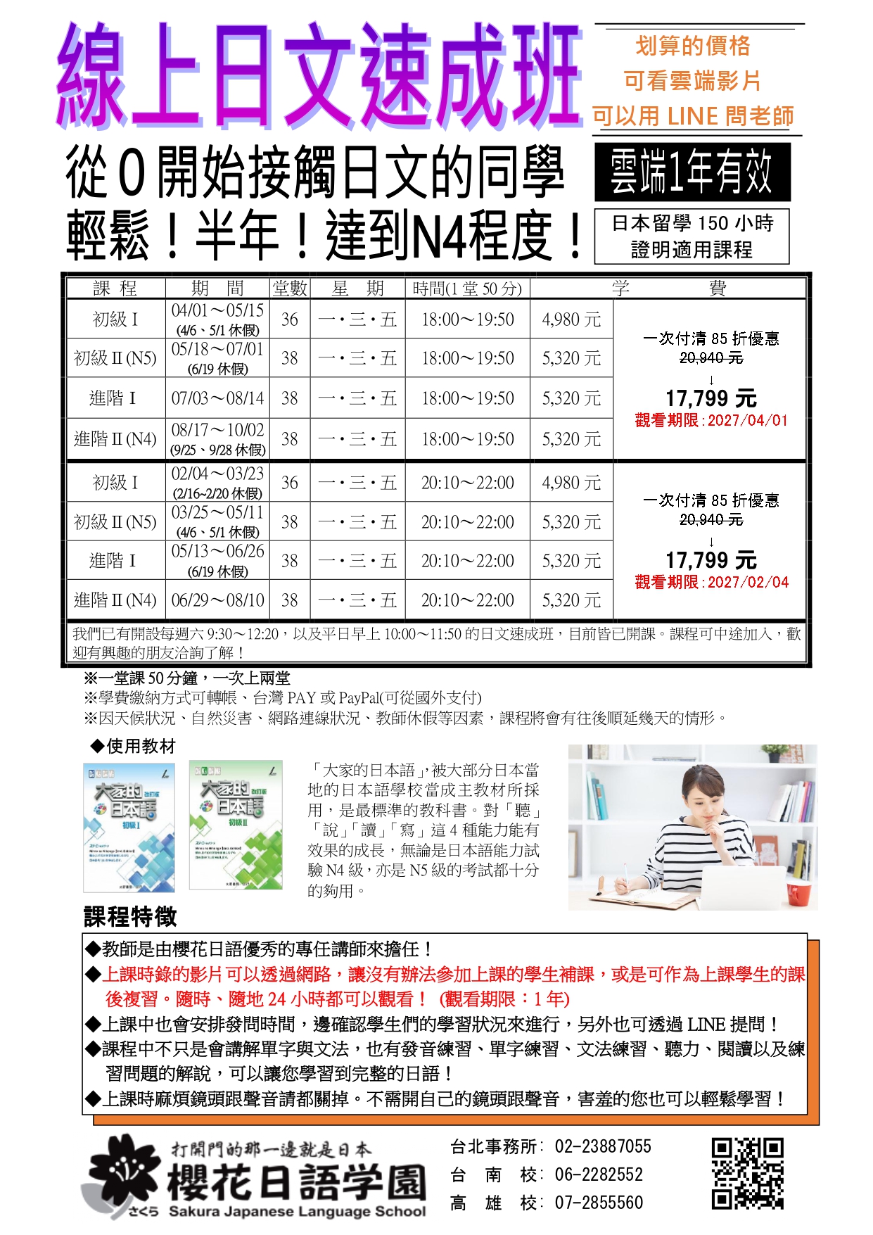 教師是由櫻花日語優秀有經驗的專任講師來擔任。從0開始接觸日文的您輕鬆快速達到N4程度!