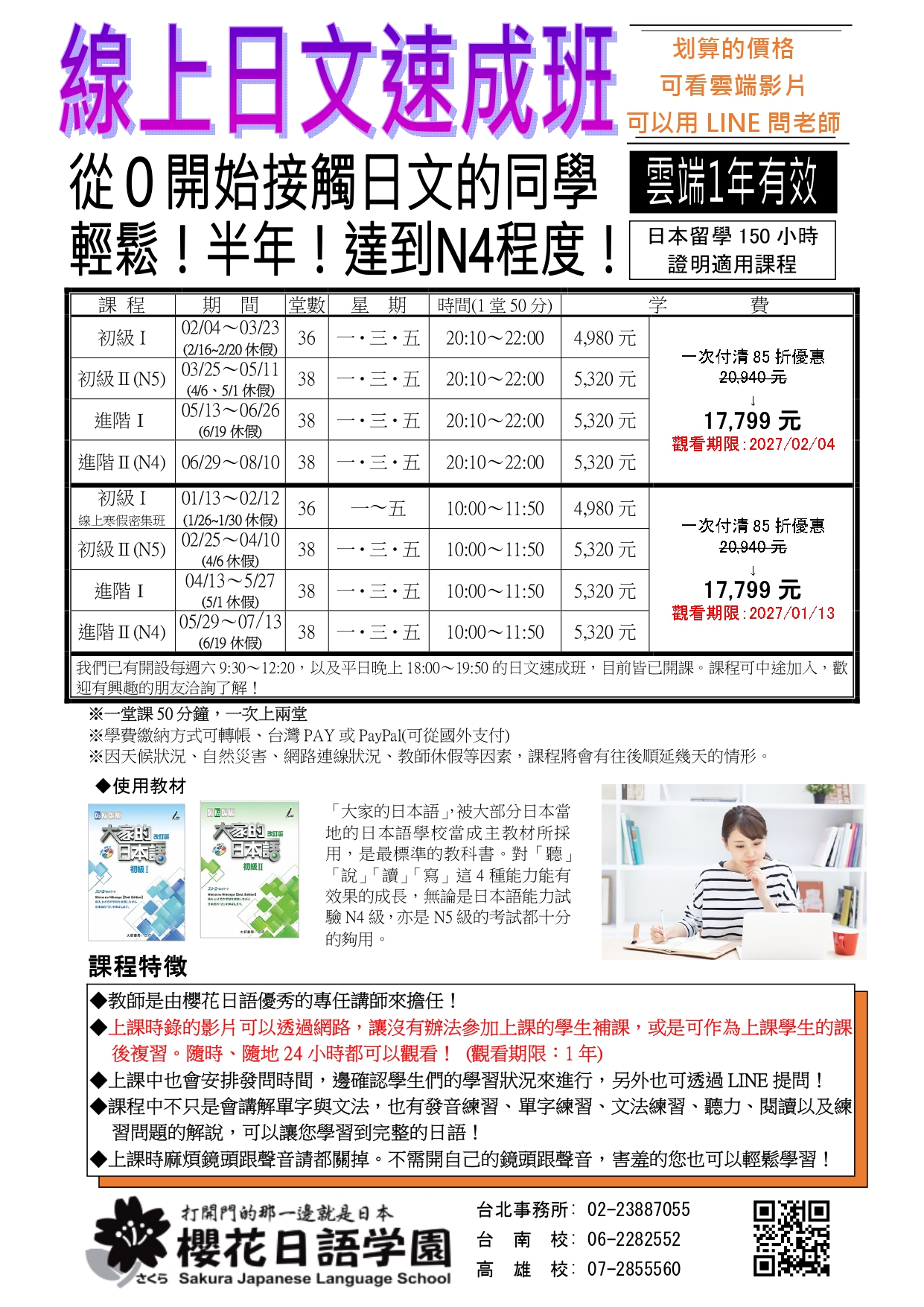 教師是由櫻花日語優秀有經驗的專任講師來擔任。從0開始接觸日文的您輕鬆快速達到N4程度!
