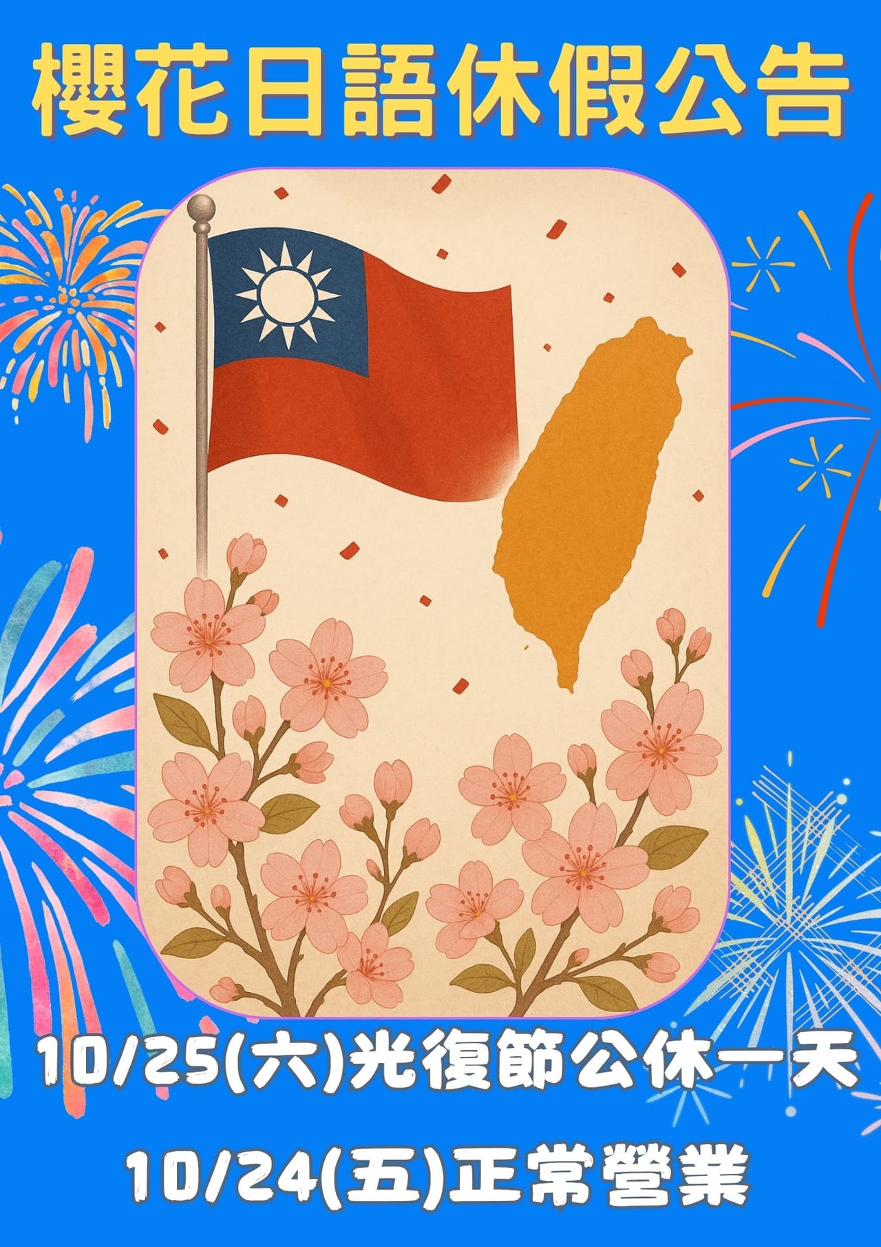 【公告】因光復節10/25(六)公休一天 10/24(五)正常營業囉!