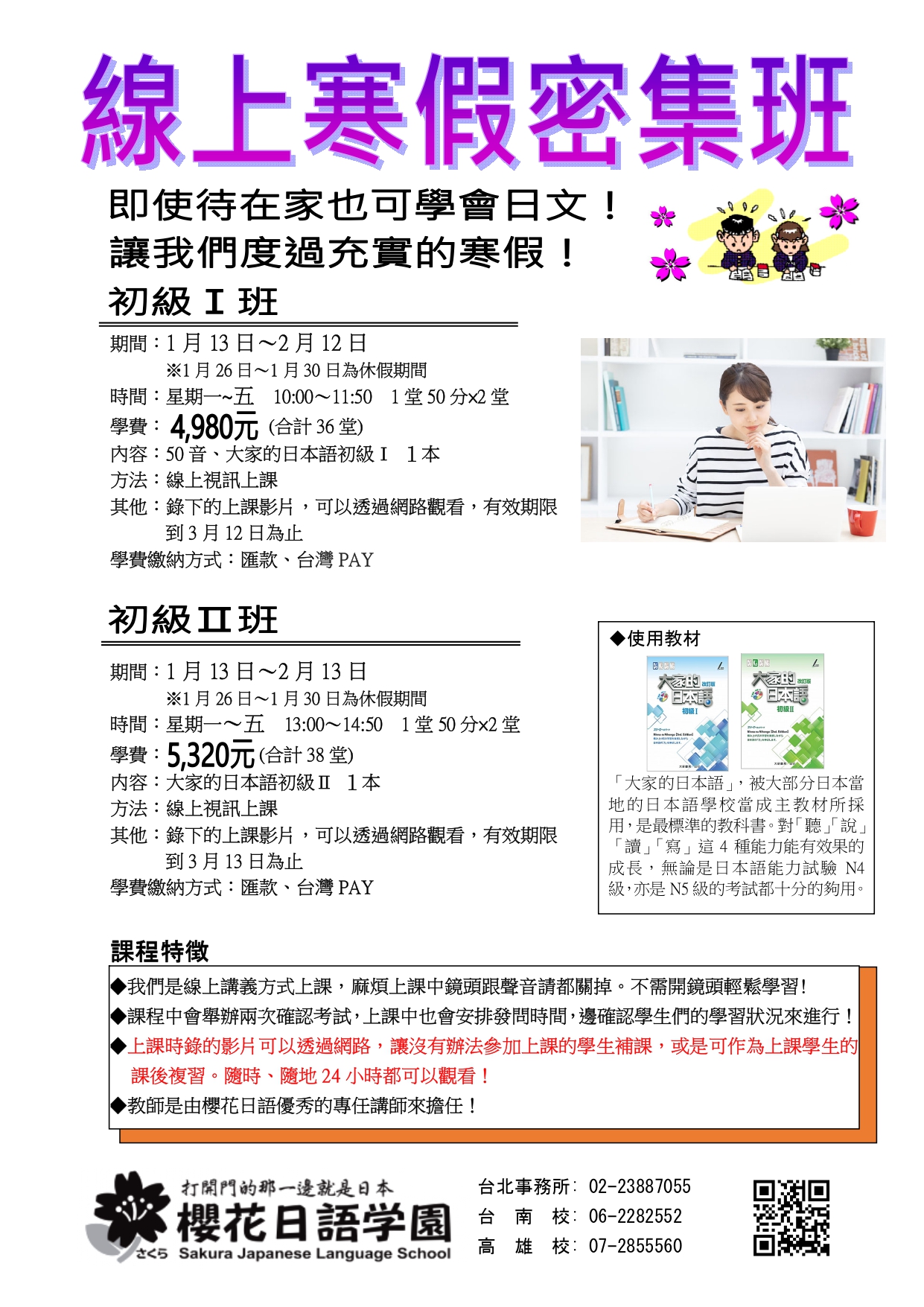 教學經驗10年以上的櫻花日語的專業老師擔任課程。上課內容確實、收穫多,讓您過充実的寒假。