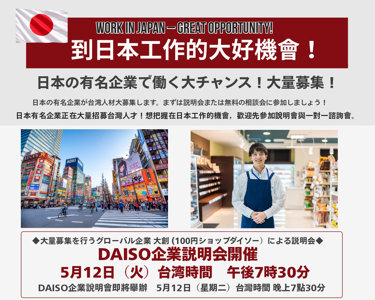 拓展至全球26個國家與地區、以100日圓商店DAISO廣為人知的株式会社大創,現正大量招募優秀的台灣人才,歡迎來日本發展、展現實力!